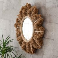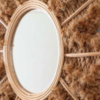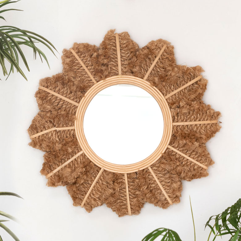 太陽や花を連想させる、ラタンと麻でできたウォールミラー。