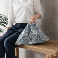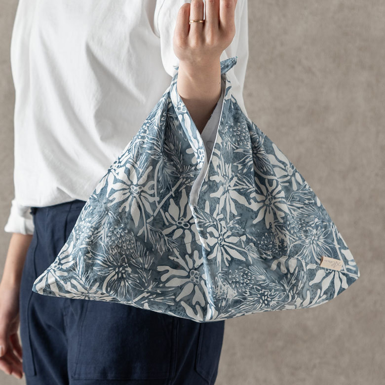左右の三角形をきゅっと結ぶだけで、持ち手が出来上がるあずま袋。
