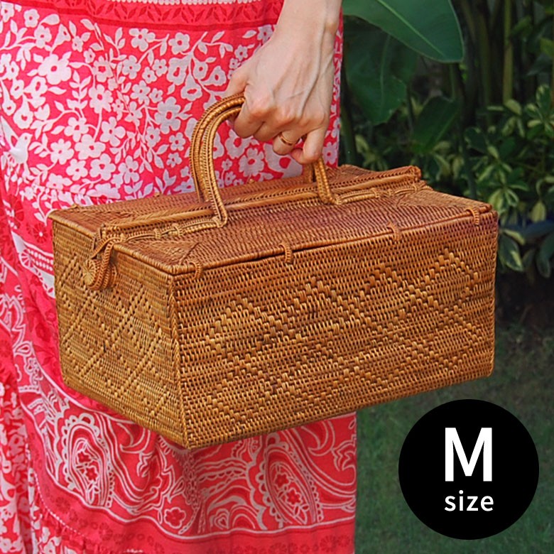 ■サイズ(cm): 外寸:約 W 35 × D 22.5 × H 22 内寸:約 W 19 × D 21 × H 12.5 / W 9 × D 21 × H 12.5 ※こちらの商品サイズはハンドル・突起部分も含まれております。 ※ハンドメイド品ですので多少サイズは前後します。 ■クオリティ:スタンダードクオリティ ■素材:アタ ■生産国:バリ(インドネシア) ■ご注意: ※ハンドメイドのためサイズ・形が写真と異なる場合があります。 ※複数個を同時にお買い求めの際はサイズに若干のバラつきがでる場合があります。 ※乾燥によってアタの繊維が収縮すると”ゆがみ”が生じる場合があります。小さなゆがみであれば逆方向にひねれば解消することができます。強くひねり過ぎると壊れる場合もありますのでご注意ください。 ※ココナッツの殻で燻していますので、香ばしい香りがします。