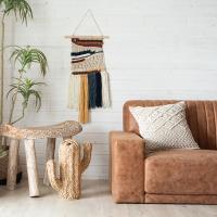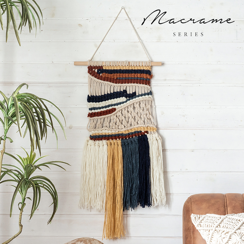 インドの職人によって手網みで作られた立体感のある模様や、軽やかに揺れるフリンジは、アートパネルやオブジェには出せない温かみのある雰囲気を演出します。