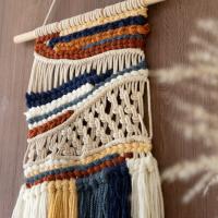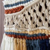 6色の糸を彩り豊かにミックスし、マクラメ編みで仕上げたタペストリー。