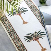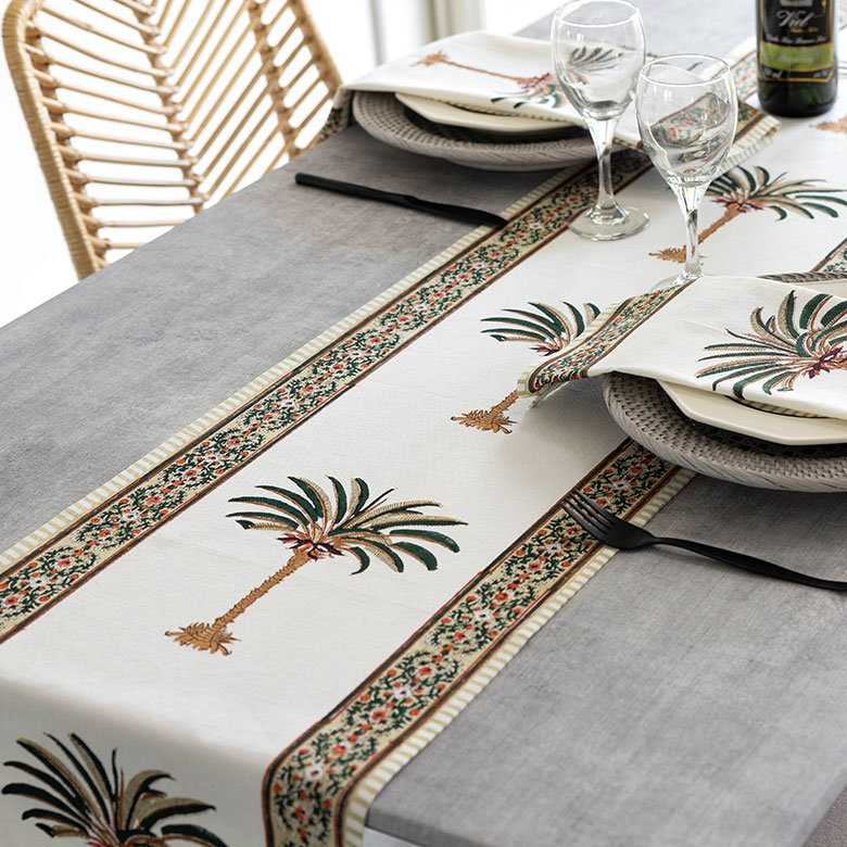 インドの伝統技法、ブロックプリントで作り上げたファブリックを使用したテーブルランナー。