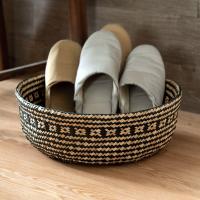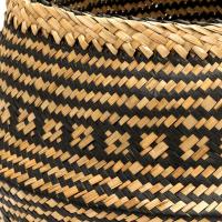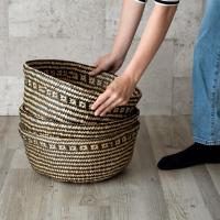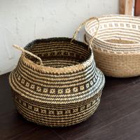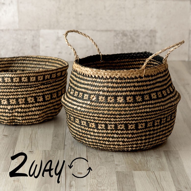 バスケット カゴ 大容量 [ブラック] シーグラス製 民族柄 深型 収納 アジア雑貨 持ち手つき コンパクト 51159