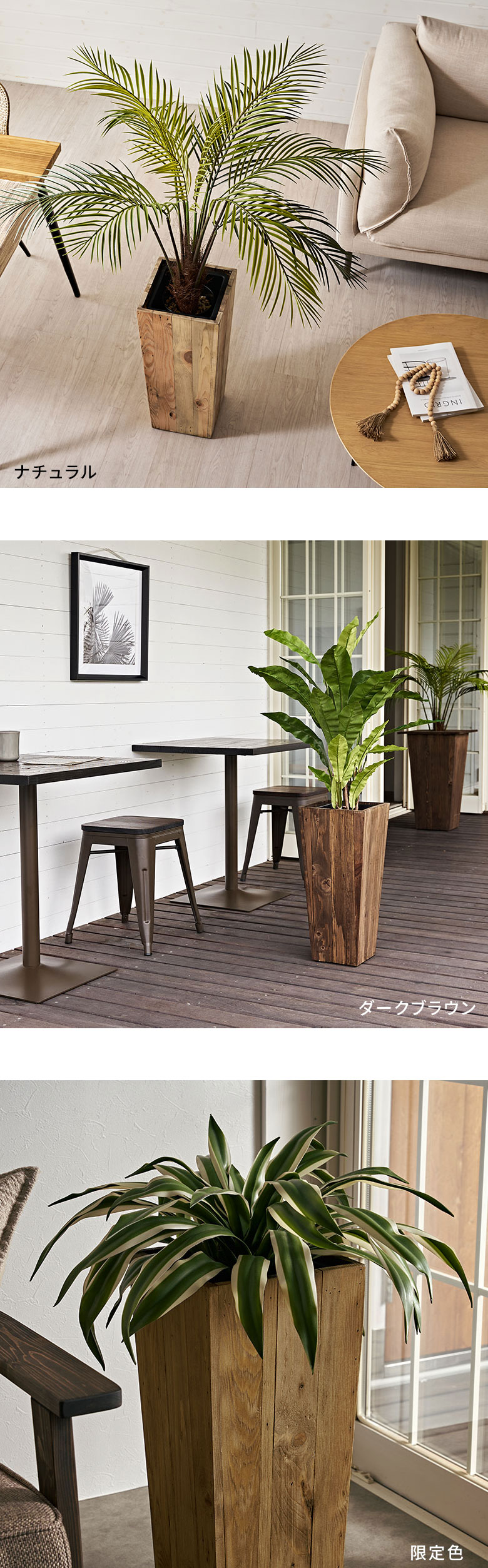 古材ならではのこなれた雰囲気が、観葉植物をぐっと惹きたてます。