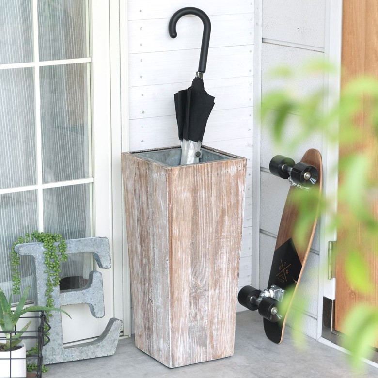 アップサイクルされたパイン材から作られた、存在感抜群の傘立て。内側にブリキのBOXがついているので、雨に濡れた傘を入れても安心です。