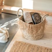 1つ1つ手作業でフリンジも一緒に丁寧に編みんだバスケット。無造作に置くだけでサマになる、インテリアのような魅力を持つビジュアル。素材には、シーグラスという日本のイグサに似た天然水草を使いました。