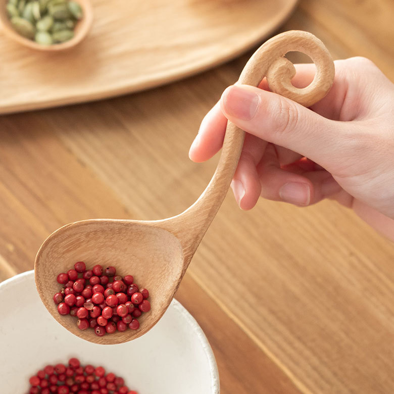 ねこのしっぽのような持ち手がキュートな、天然木(ドウシェ)のカトラリー。実用的に使いながら、テーブルコーディネートのアクセントとして楽しむこともできます。