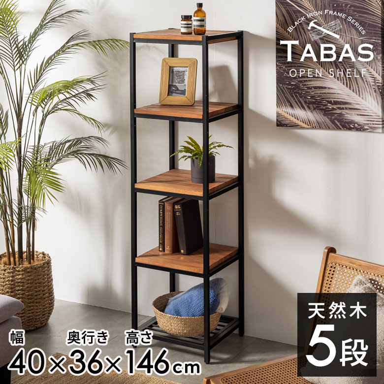 木目の美しいパイン無垢材とブラックアイアンという、異素材を組み合わせた家具シリーズ「TABAS -タバス-」の5段オープンシェルフ スリムタイプ。