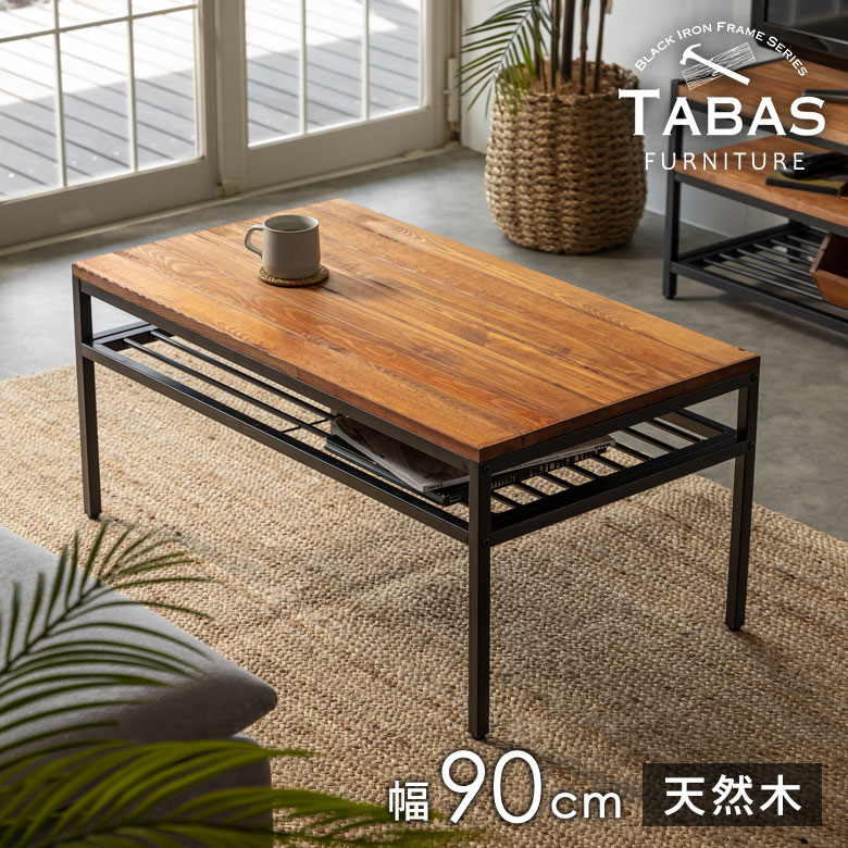 木目の美しいパイン無垢材とブラックアイアンという、異素材を組み合わせた家具シリーズ「TABAS -タバス-」のコーヒーテーブル。
