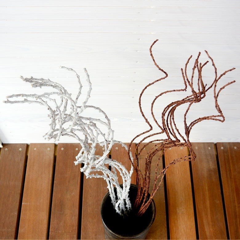 東アジアに分布しているサルトリイバラの枝を使用して作った、ホワイトとブラウンの上品なアートプランツ
