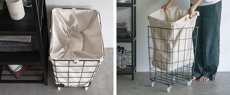 インナーには、巾着タイプの内布がついているので中身を見せたくないときは、巾着の紐を締めればすっきり隠せます。内布は取り外し可能なので、インテリアとして見せる収納にもおすすめです。360度回転するキャスター付きで移動もラクラク。
