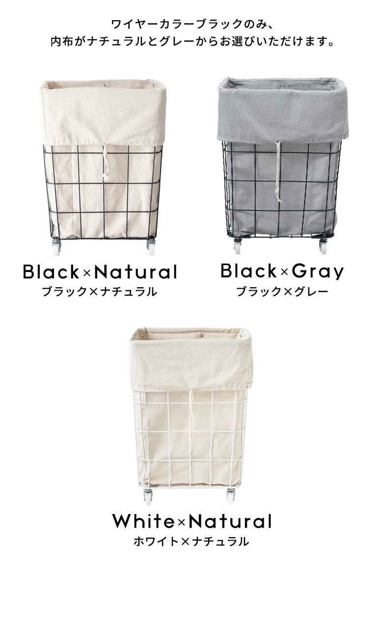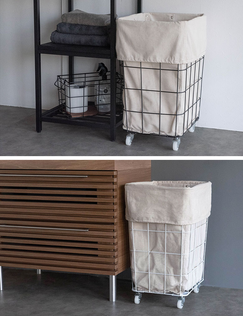 ワイヤーのカラーは、空間を引き締めるスタイリッシュな「ブラック」とやさしく清潔感のある佇まいの「ホワイト」の2色。ランドリーバスケットやリビング収納、分別用ダストワゴン、お子様のおもちゃ収納などあらゆるシーンで活躍します。