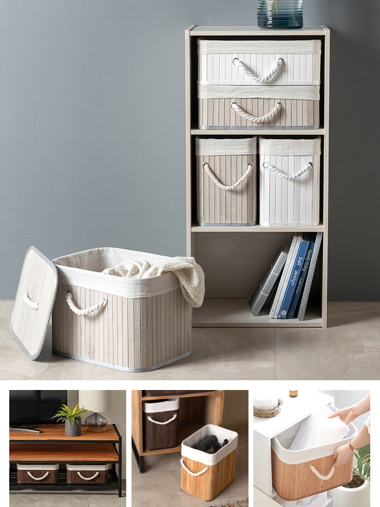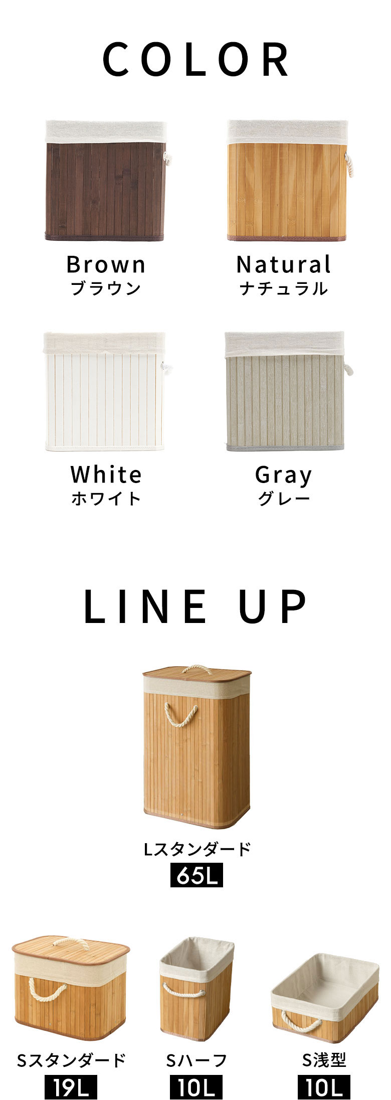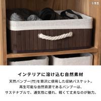 カラーはナチュラル、ブラウン、ホワイト、グレーの4色展開で、リビングや寝室、玄関、洗面所など、さまざまな空間にすっと馴染みます。収納としての機能性と、インテリアのような美しさを兼ね備えたバンブーバスケットで、いつもの空間をより心地よく整えてみませんか。