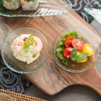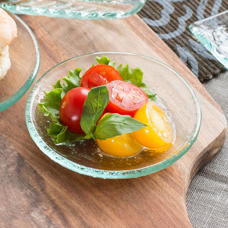 淡いブルーが涼しげな、小さなガラストレイ。シャンパンの泡のような小さな気泡が散りばめられた質感とぽってりとした肉厚なフォルムで、シンプルながらも味のあるトレイです。