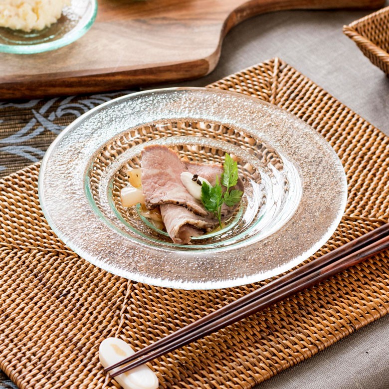 水面をすいくとったような美しく涼しげなデザインで、いつものダイニングに爽やかなリゾート感をプラス!どんなお料理とも相性の良い、透明感のあるガラスプレート。