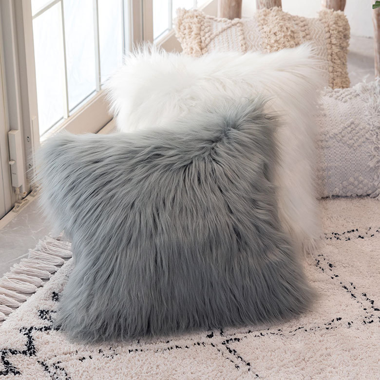 クッションカバー 約45×45cm ロングファー 正方形 グレー シンプル 上品 華やか 北欧 おしゃれ ファスナー付き 6668