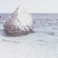 海岸の岩と白い砂浜がリズミカルな構図の一枚。
