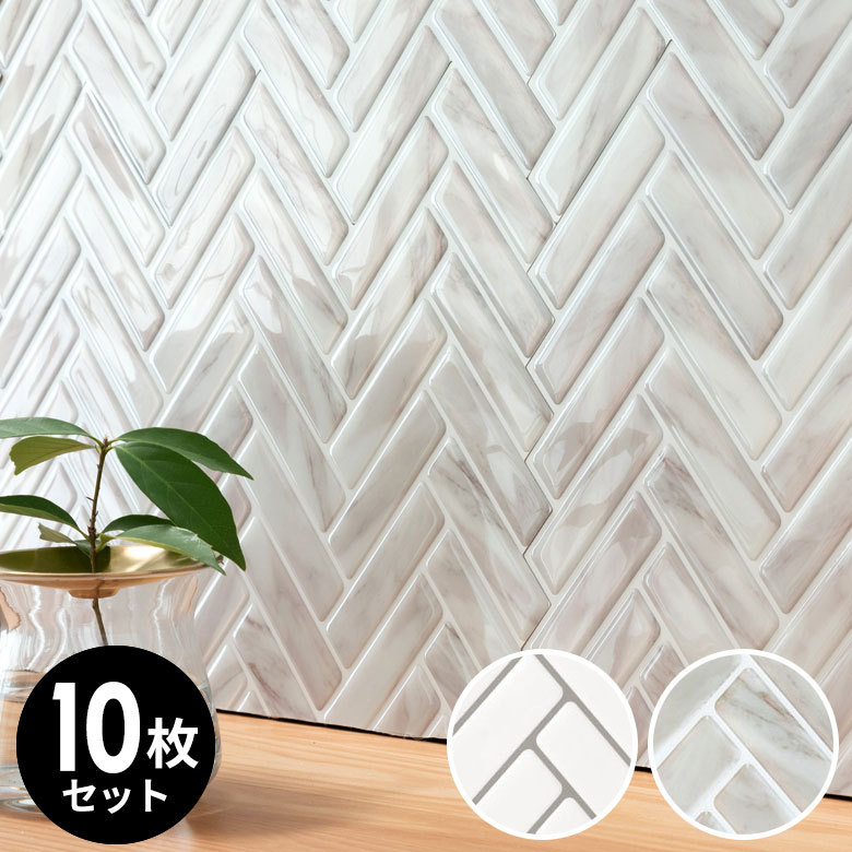 タイルシール ヘリンボーン 10枚入り 正方形 シート ホワイト マーブル 水回り 防水 DIY ウォールステッカー 台所 キッチン 洗面所 トイレ 67028-10