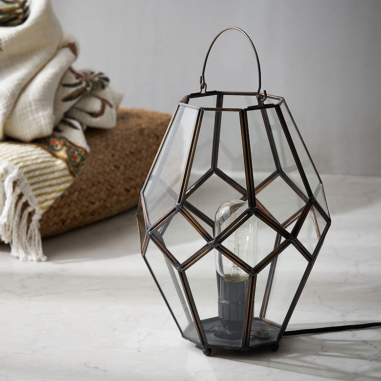 アンティーク調に仕上げた真鍮フレームにひとつひとつ手作業で溶接された、多面体のガラスに光が反射して広がります。
