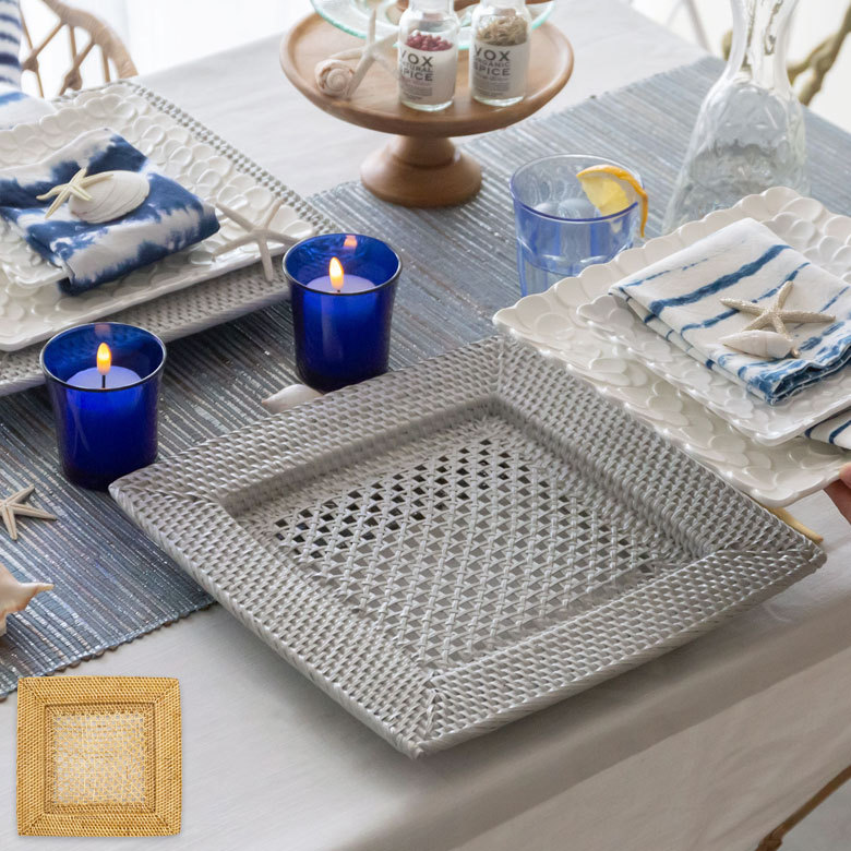 シンプルなお皿も素敵に魅せるレイヤードテクニック!リゾートライクなダイニングを演出する、プレートトレイ。インドネシアの職人がひとつひとつ丁寧に編み込み、ナチュラルな素材感を活かしながら美しく染め上げました。