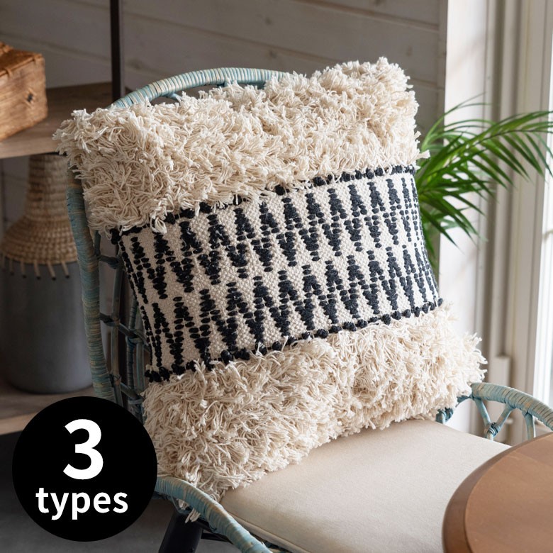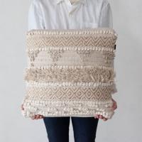 インドコットンを使用した、BOHO(ボーホー)スタイルのクッション。お部屋のテイストを選ばないカラーリングで、インド産ならではの素朴さと、たくさんあしらわれた刺繍やフリンジが魅力的。どのデザインも両面にデザインがあり、裏表なく使えます。