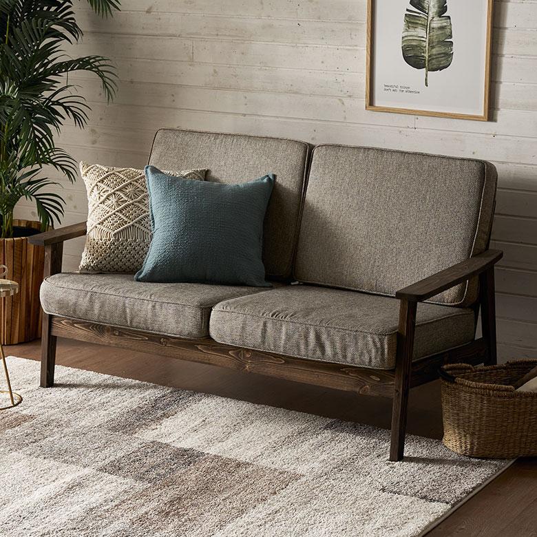美しい木目の天然木パイン材のフレームと、温かみのあるファブリック。上品で素朴な雰囲気が魅力的な2人掛けのソファ。
