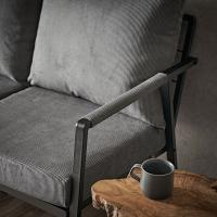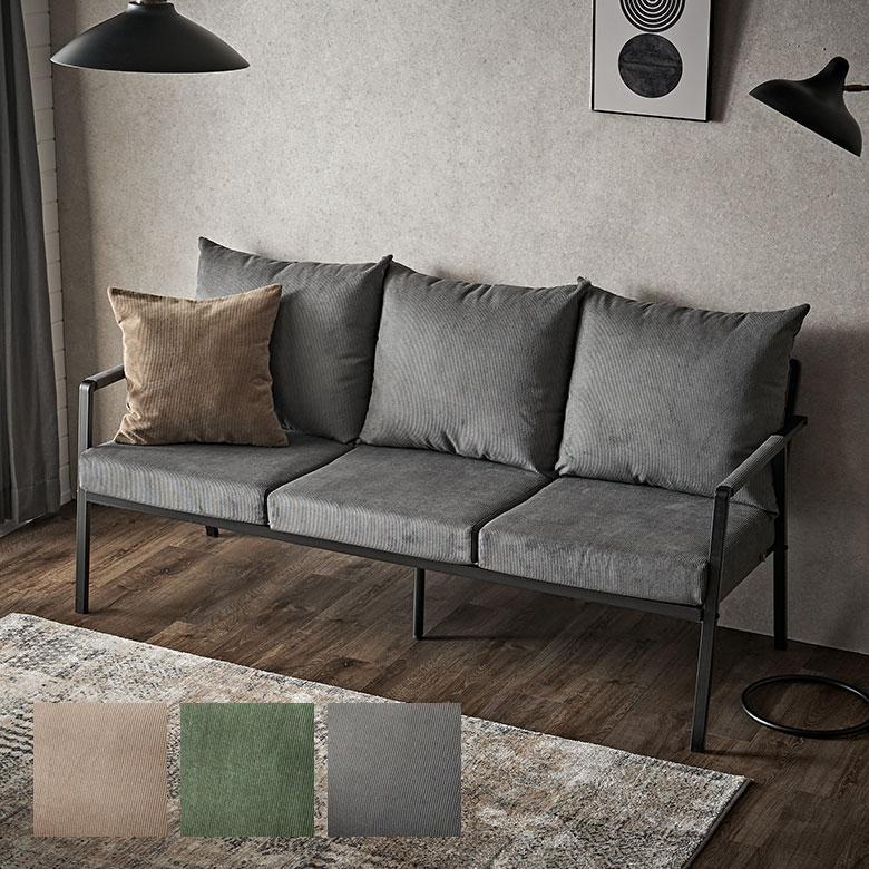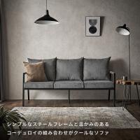 シンプルなスチールフレームと、温かみのあるコーデュロイの組み合わせがクールなソファ。