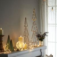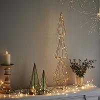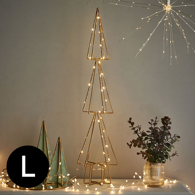 ゴールドのフレームにストリングライトを飾り付けた、ツリーのデコレーション。金属のパーツを直線的に組み合わせた、今までにないスタイリッシュさが魅力。