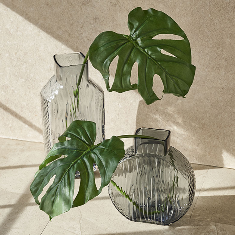 モンステラの葉は、単体でもその存在感が際立ち、空間に動きをもたらします。茎が長いため、大きめの花器や細長いタイプの花瓶などと組み合わせて、さまざまなアレンジを楽しめます。また、数枚組み合わせて飾るのもおすすめです。鮮やかなグリーンリーフが、お部屋に洗練された印象を与えてくれます。