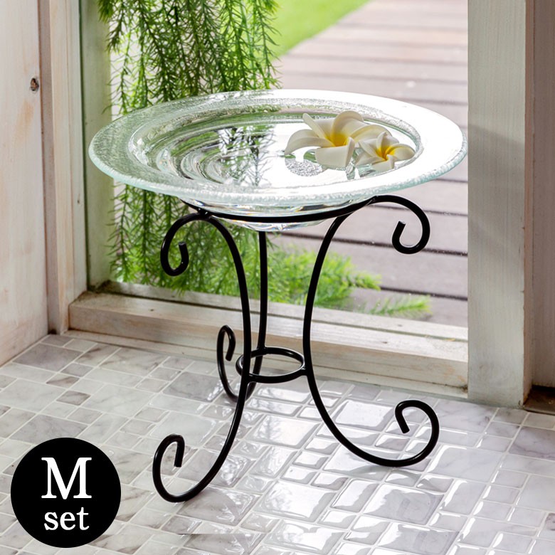 癒しの南国リゾート気分を味わえる、ガラスの水盤とそれを支えるアイアンスタンドのセット。