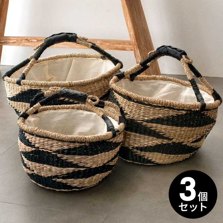 カゴ 収納 バスケット 持ち手付き カゴバッグ 3サイズセット シーグラス製 ラウンドバスケット トライバル柄 かご収納 アジアン おしゃれ set-51196-98