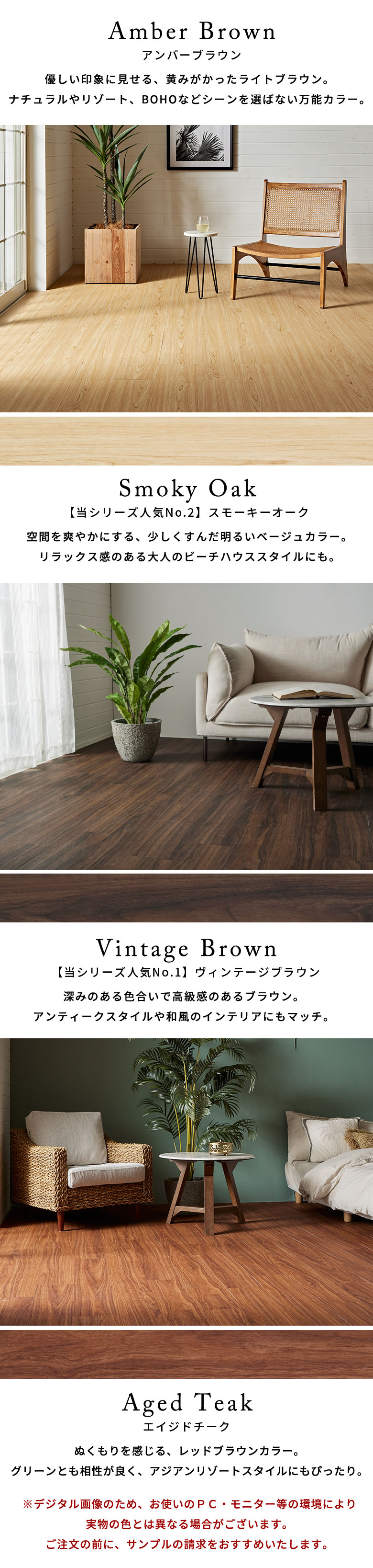 チークやオークなどの美しい木目が映える板目は、まるで本物のフローリングのようにリアルな質感。