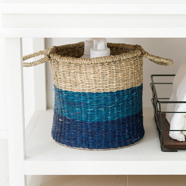 3色のグラデーションが美しい、小さめサイズのバスケット。使いやすいサイズ感で、さまざまなシーンで活躍してくれます。玄関でスリッパを入れたり、キッチンでストック保管用として使ったり。ハンドル付きで、持ち運びが簡単なのも嬉しいですね。他のシーグラスバスケットや、大きいサイズと並べて使っても素敵です。かご・バスケット一覧はこちら>>