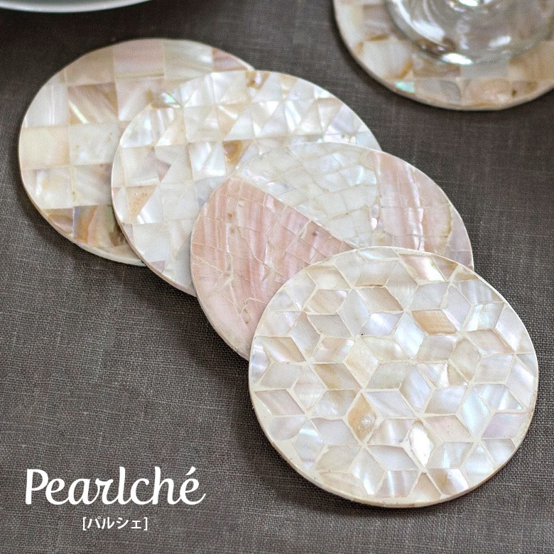 パールシェルをモザイクのように貼り合わせたコースター。