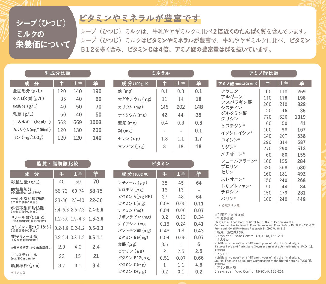 シープミルクはビタミンやミネラルが豊富で、牛乳やヤギミルクに比べ、ビタミンB12を多く含み、ビタミンCは4倍、ビタミンEは3倍、チアミンは2倍も含まれています。