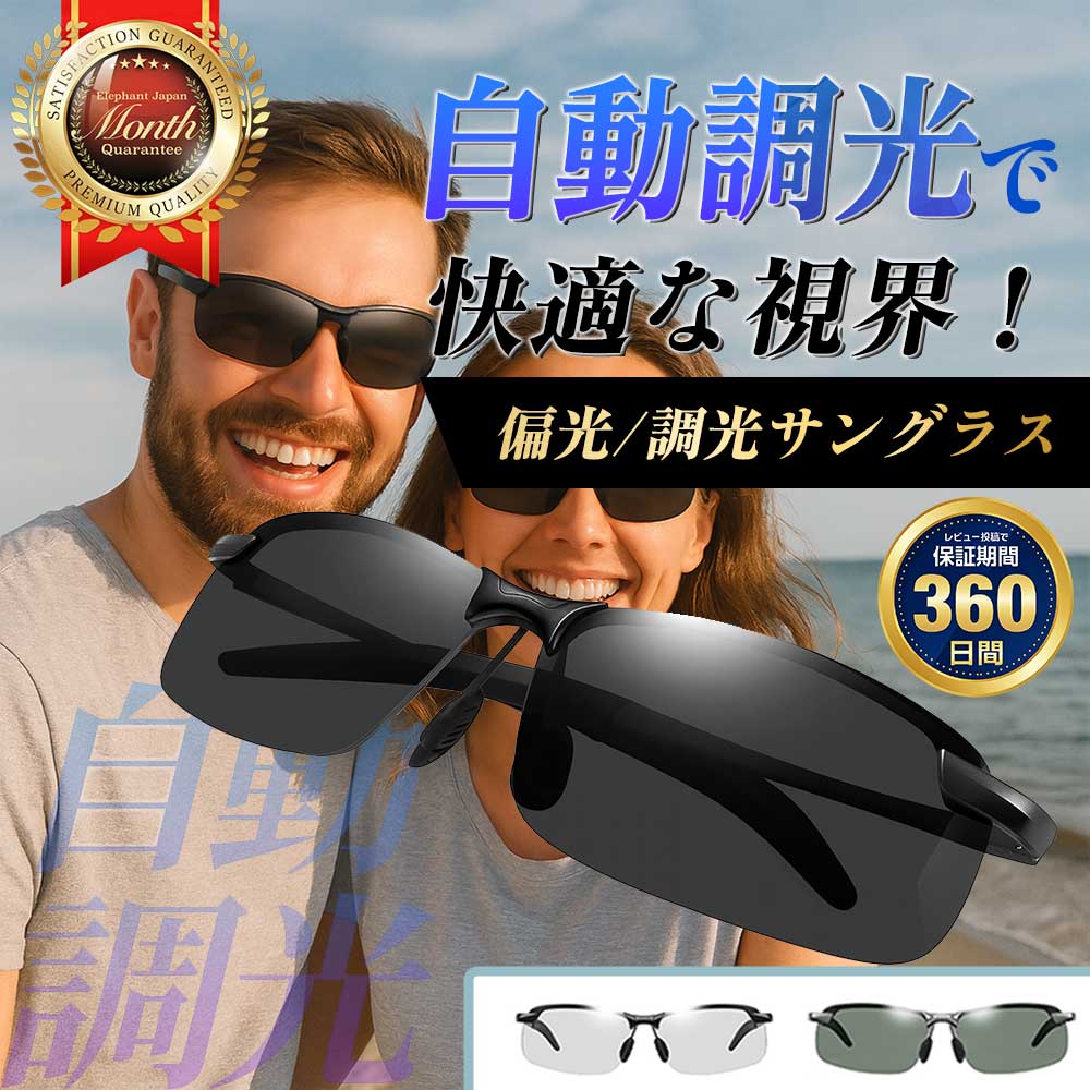 | 【商品仕様】 | セット内容:サングラス本体、専用ケース、レンズクロス、メガネ用曇り止め レンズ特性:UV400/調光/偏光 |