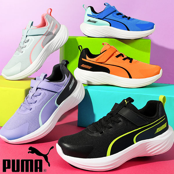 サイドのプーマストリップを囲むラインが引き立つデザインです。メッシュアッパーを使用しており、軽量な履き心地と高い通気性が魅力。クイッククロージャーで靴紐が苦手なお子様でもフィット感の調整が簡単です。スピード感を感じさせるかかとのPUMAロゴは、元気なお子様の普段使いにぴったりのデザイン。