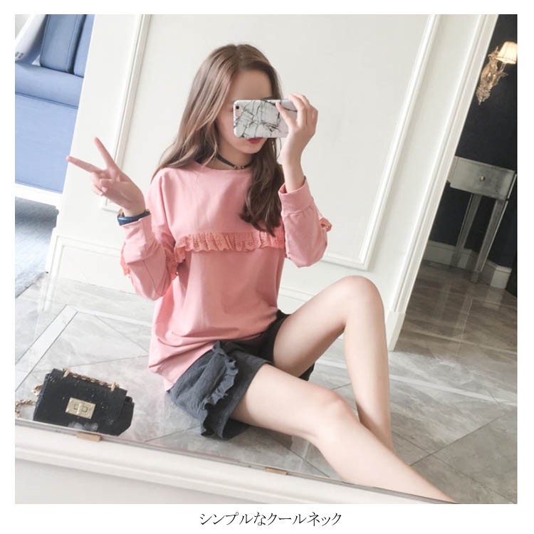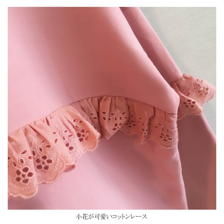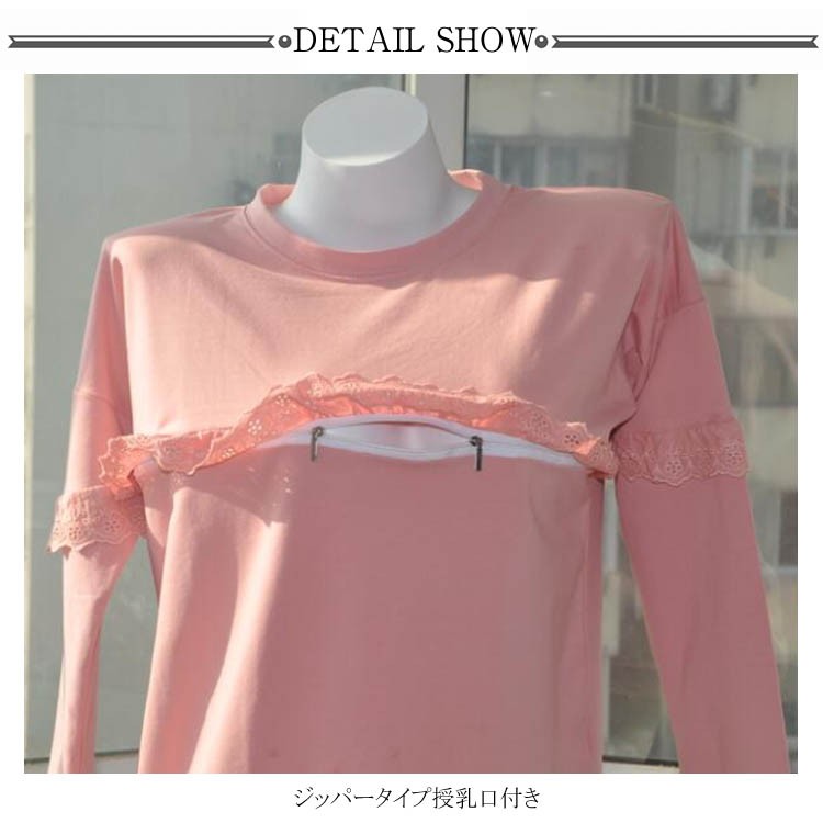 デザインに工夫を凝ったお洒落な人気授乳服。胸元に可愛いコットンレースをあしらい、フリルの下に授乳口ファスナーが上手に配置されたスマートなデザインに感心。授乳服に見えない かわいい おしゃれ 楽ちんな授乳トップスです。コットン100%生地で、ママにも赤ちゃんにも安全・安心。すぎず薄すぎない生地、春秋の主役級アイテムに間違いなしです。