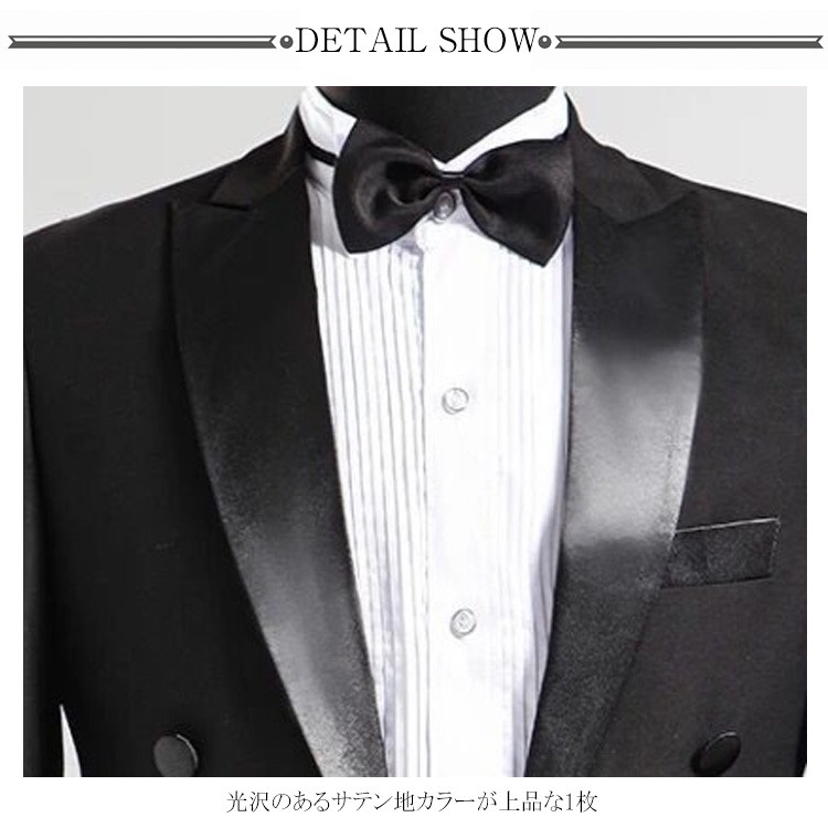 大ヒット!豪華なタキシード4点セットが登場しました。ジャケット、ズボン、蝶タイ、マーベルトの4点セットとなっています。ディテールにこだわり、計算された綺麗なシルエットが男色を演出してくれます。コンサート・演奏会・合唱・結婚式・パーティーなど様々なシーンで大活躍する当店一押しアイテムです。