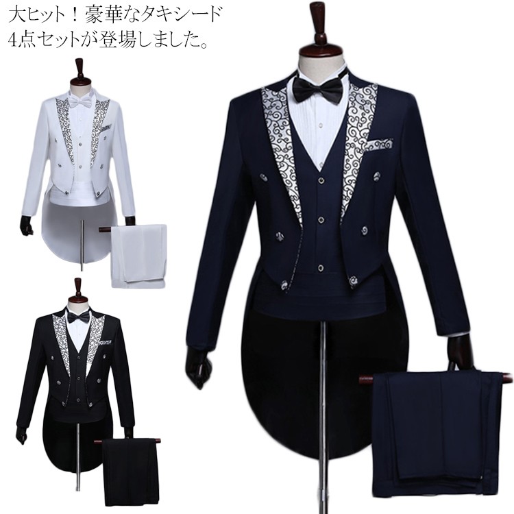 タキシード メンズ 豪華な4点セット 燕尾服 上下セット フォーマル スーツ 演出服 結婚式 お花婿 礼服 コンサート 宴会 パーティー 芸人 お笑い