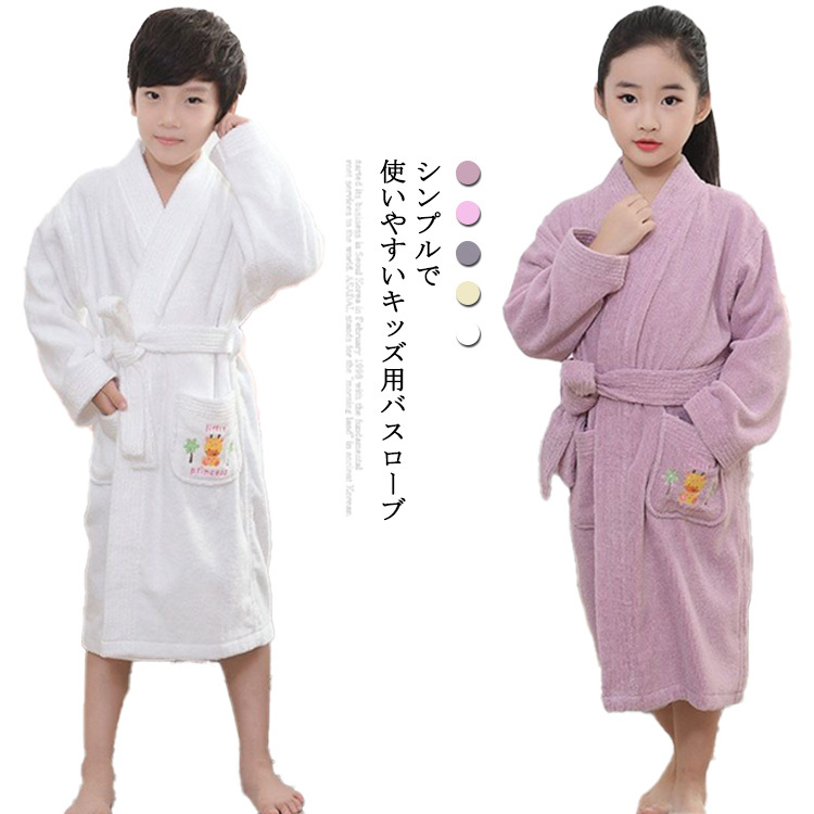 | シンプルで使いやすいキッズ用バスローブ。お風呂上りにさらっと着るだけで体について水分もしっかりと吸水してくれるタオルのような優れもの!保温・保湿性を兼ね備えており、お風呂上りの肌から水分が蒸発するのを防いでくれるので乾燥を防ぎスキンケアすることができます。ポケット付きで小物を収納できるのも嬉しいポイントです。旅行やレジャーなどのルームウエアや、バスタオル代わりとしても。 | |