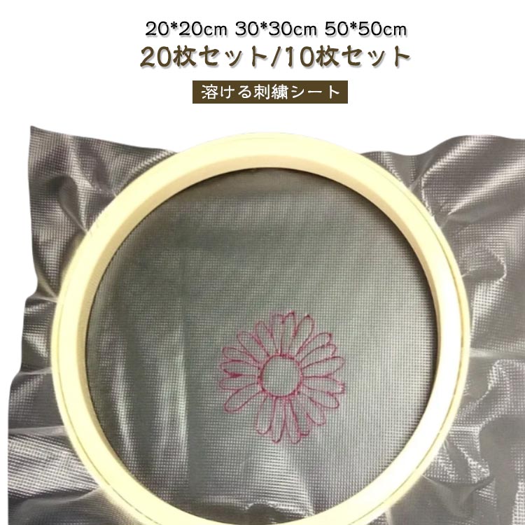 | 【20枚セット/10枚セット】 【20*20cm 30*30cm 50*50cm】 刺しゅうした後に水で溶ける不織布のシートです。 図案も透けるので写しやすく、シールのように土台布に貼れるのでしつけも不要です。 身近なイラストをそのまま刺繍にしたり、直接、お好きな絵を書いて使うこともできちゃいます。 シールタイプにある、作業中に針にのりがついてベトベトしてしまう、そんなトラブルも心配いりません。 完成後、水で流すと、”あらっ不思議”シートが消えてなくなってしまいます。 20x20cm 30x30cm 50x50cmの3タイプ!サイズに応じて選んでください。 | |