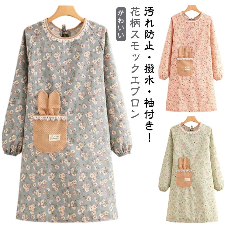 | 汚れ防止・撥水・袖付き!花柄スモックエプロン ゆったりしたサイズ設計になっていて、服の上からの着用が楽ちんです。 袖口はゴムいりなので作業中も腕まくりがしやすいことはもちろん、着ている服が出てくる心配はありません。 かわいいだけじゃなく、スマホも入る大きめポケット付き。 | |