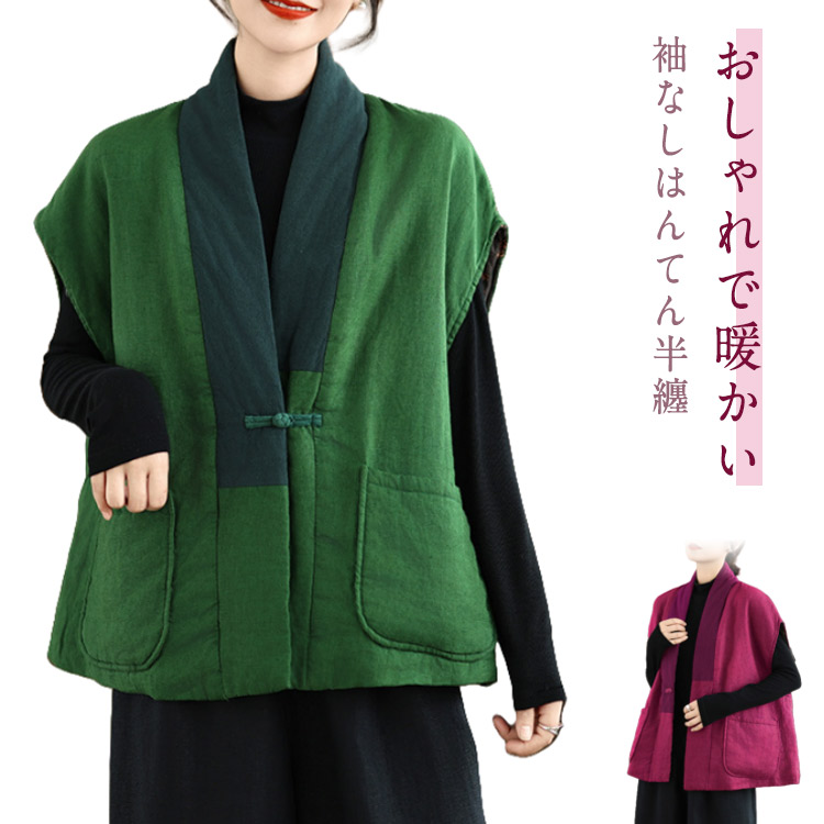 袖なし はんてん お出かけ 冬 おしゃれ 綿麻 部屋着 レディース 半纏 はんてん 半天 袢纏 30代 暖かい ルームウェア 綿入れ 綿入り 中綿ベス