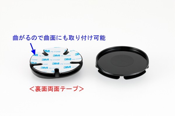 吸盤タイプ車載スタンド用の取付用シート(ベース)(曲面対応)です。ダッシュボートが、吸盤が吸着しずらい素材のときに、この取付用シートを貼り付けて、スタンドを固定します。 接着面が曲がりますので曲面部に吸盤スタンドを取り付けるときに使用します。直径:90mm、裏面は両面テープ直径:85mmまでの吸盤に対応できますので、パナソニック、ユピテル、カロッツエリア等の純正吸盤スタンドに使用できます。住友3M製両面テープを使用しています。◆ 取り付け方法 1 ダッシュボードの取付面を脱脂します(油分を完全に拭き取ってください) 2 曲面や取付面に合わせてシート粘着部を曲げておく 3 シート接着部をドライヤー等で温めてから貼り付け、24時間以上放置させてから使用してください