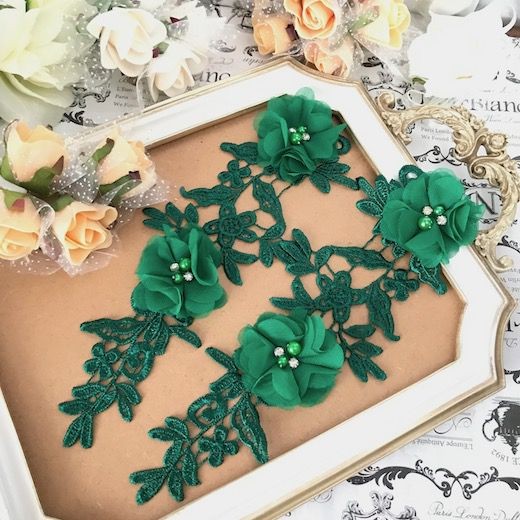 モチーフレース 左右セット 綺麗 花 フラワー ケミカルレースアップリケ モチーフ グリーン ペア セット 新体操 衣装モチーフ レオタードモチーフ