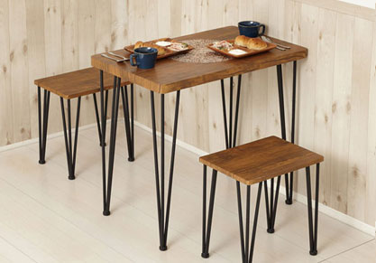 | 木目調とスチールの組み合わせがスタイリッシュ。 場所をとらないコンパクトな3点セットです。 天板・座面は、角を丸く加工しており、手触りもやさしく安全面にも配慮しました。 スチール素材のスマートな脚はマットな質感がスタイリッシュな印象です。 テーブル・チェアともに、床へのキズを防止するプラスチックカバー付きです。 | ||||||||||||||||||||