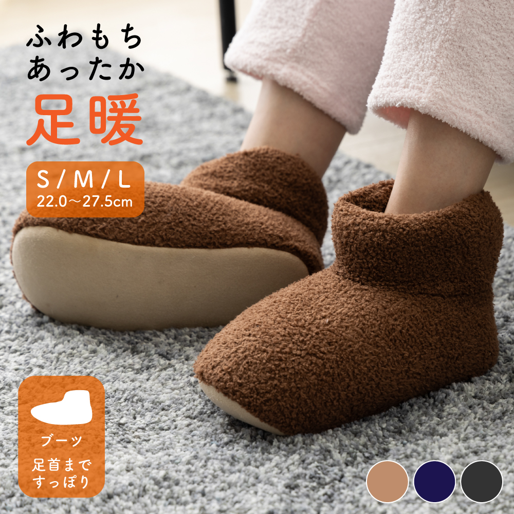 足首までもこもこなブーツタイプで超あったか!体温を逃さず、足首の血管を包み込むので足が温まりやすくなります。一般的なスリッパと比べ軽さと暖かさが段違いです。