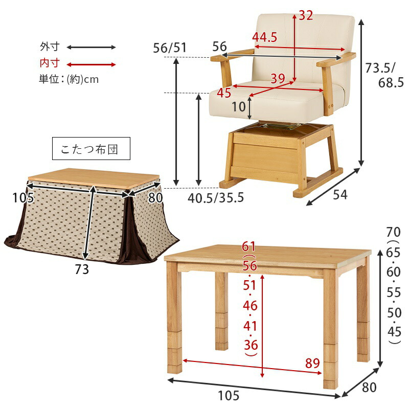 こたつ:(約)幅105×奥行80×高さ45/50/55/60/65/70cm