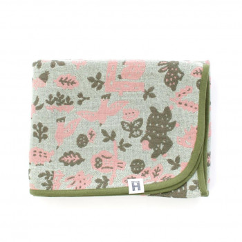 動物、昆虫、植物、風景、それら全てに物語を込めて作家が手彫りで描いたユニークでやさしい世界を、今治のタオル職人が熟練の技術で色彩豊かに織り上げました。人々の日常にあたたかな空気と笑顔をもたらすタオルです。肌寒い時のひざ掛けや、お部屋のアクセントにおすすめです。ベビーカーに乗った赤ちゃんを、日差しや寒さから守るためにもお使いいただけます。グリーンの裏面がピンク基調の柄です。